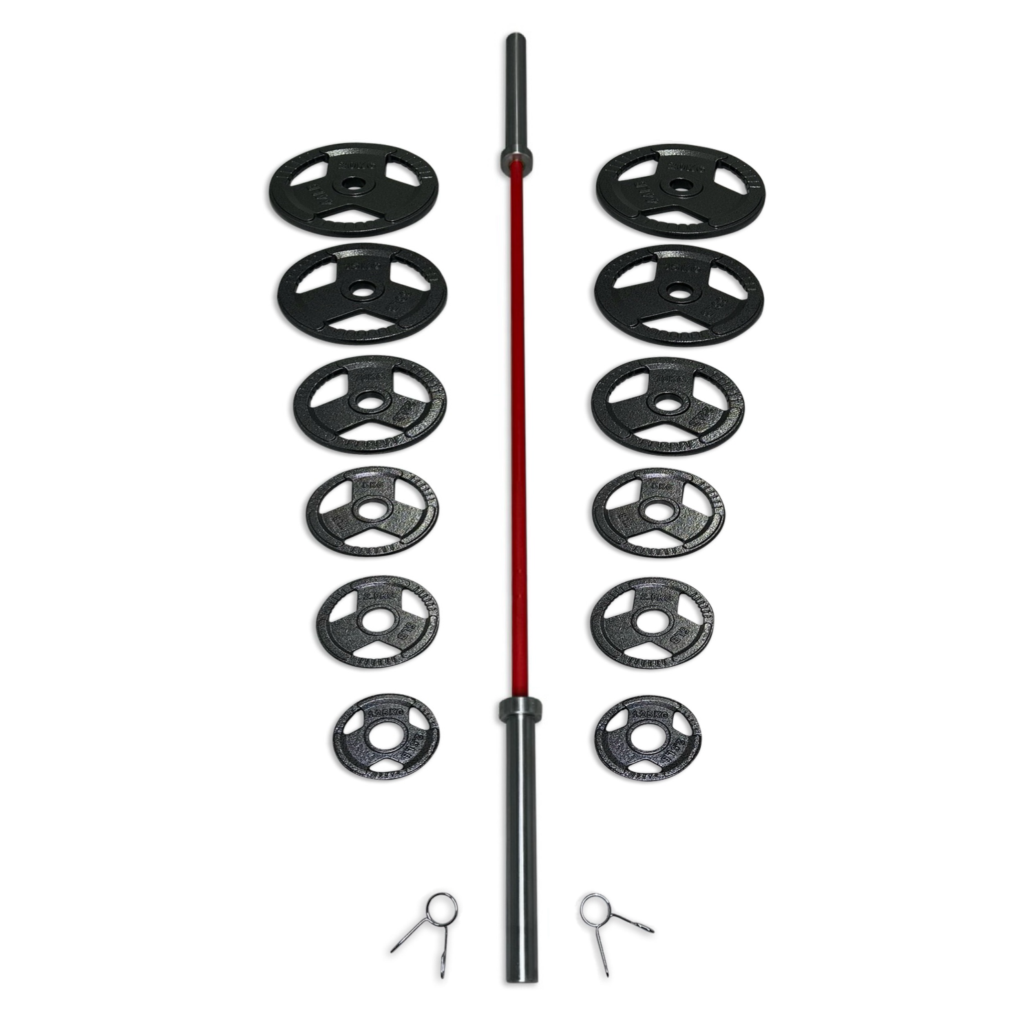 Please note: Due to image editing, product photos may not fully reflect the finish or dimensions. Additionally, the product images may not appear in the same order as the barbell variants listed. For unedited, high-resolution images, please visit the “Olympic 2” Weight Plates” section or contact us directly. 115kg is a rounded down weight, total weight of this set with a 5 foot barbell is approx. 115.9kg.