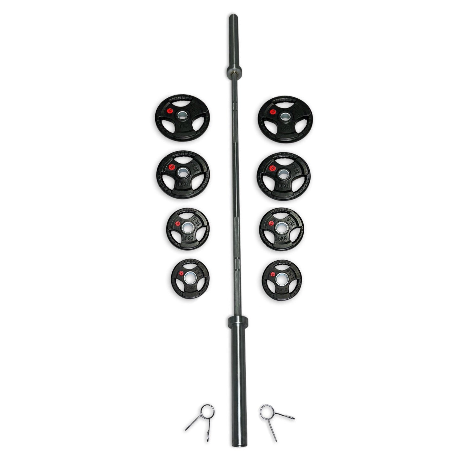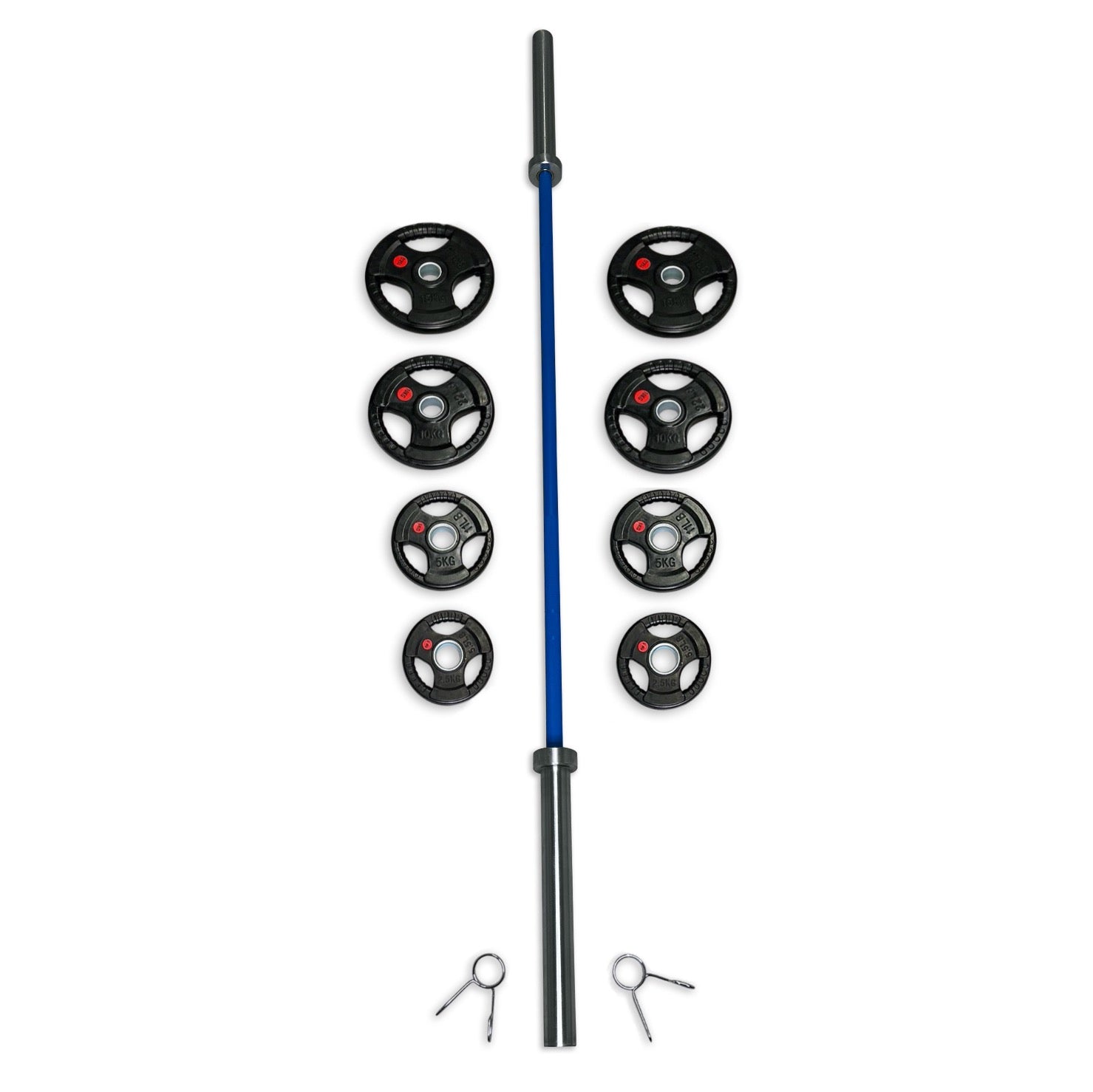 Please note: Due to image editing, product photos may not fully reflect the finish or dimensions. Additionally, the product images may not appear in the same order as the barbell variants listed. For unedited, high-resolution images, please visit the “Olympic 2” Weight Plates” section or contact us directly. 73kg is a rounded down weight, total weight of this set with a 5 foot barbell is approx. 73.4kg.